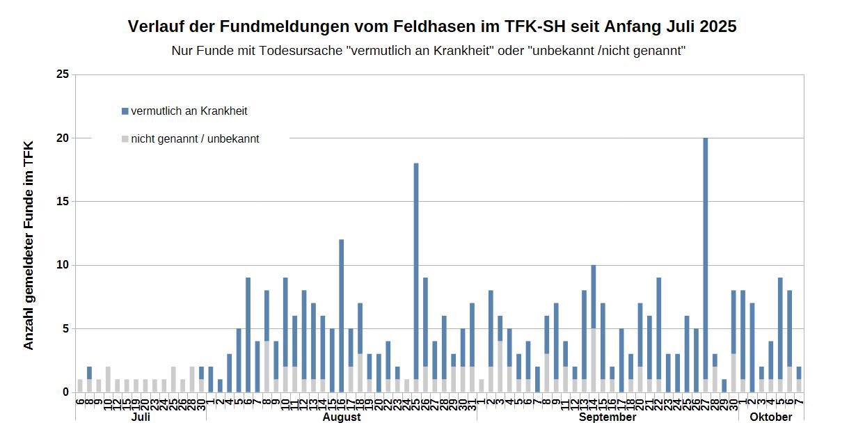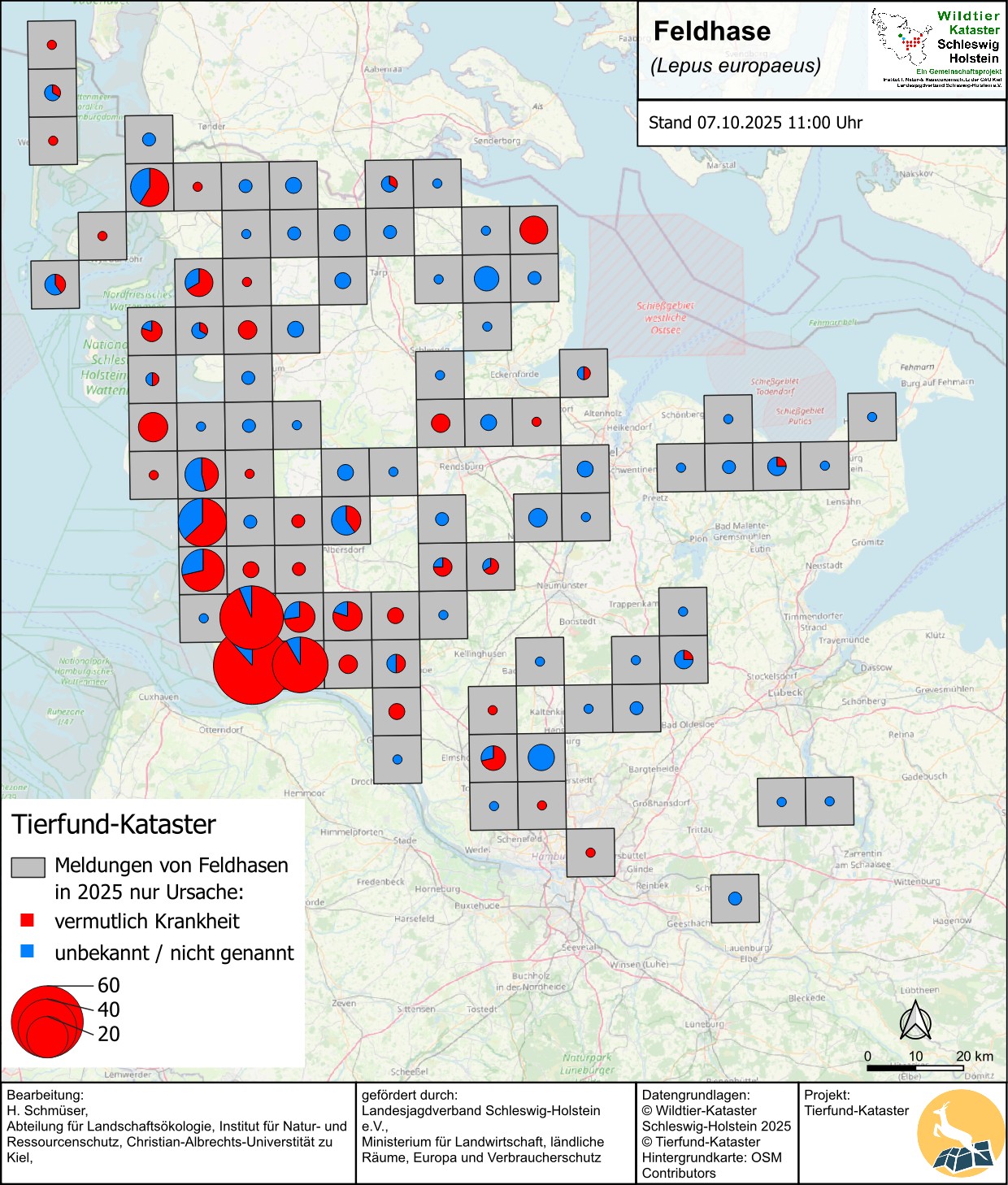 Aus gegebenem Anlass (Myxomatose: Erste Fälle bei Feldhasen in Schleswig-Holstein bestätigt) werden wir hier regelmäßig über den Stand informieren, wie er sich aus den Daten unseres Tierfund-Katasters ergibt.