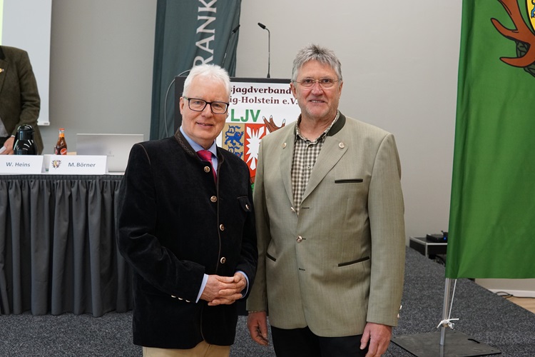 Ein weiterer Schwerpunkt der Versammlung waren Ehrungen für besonderes Engagement im Verband. Hans-Heinrich Jaacks wurde mit der DJV-Verdienstnadel in Silber ausgezeichnet. Andreas-Peter Ehlers erhielt das Ehrenmesser und somit die höchste Auszeichnung des Verbandes. Wolfgang Heins wurde zum Ehrenpräsidenten ernannt und damit für seinen langjährigen Einsatz an der Spitze des Verbandes gewürdigt.