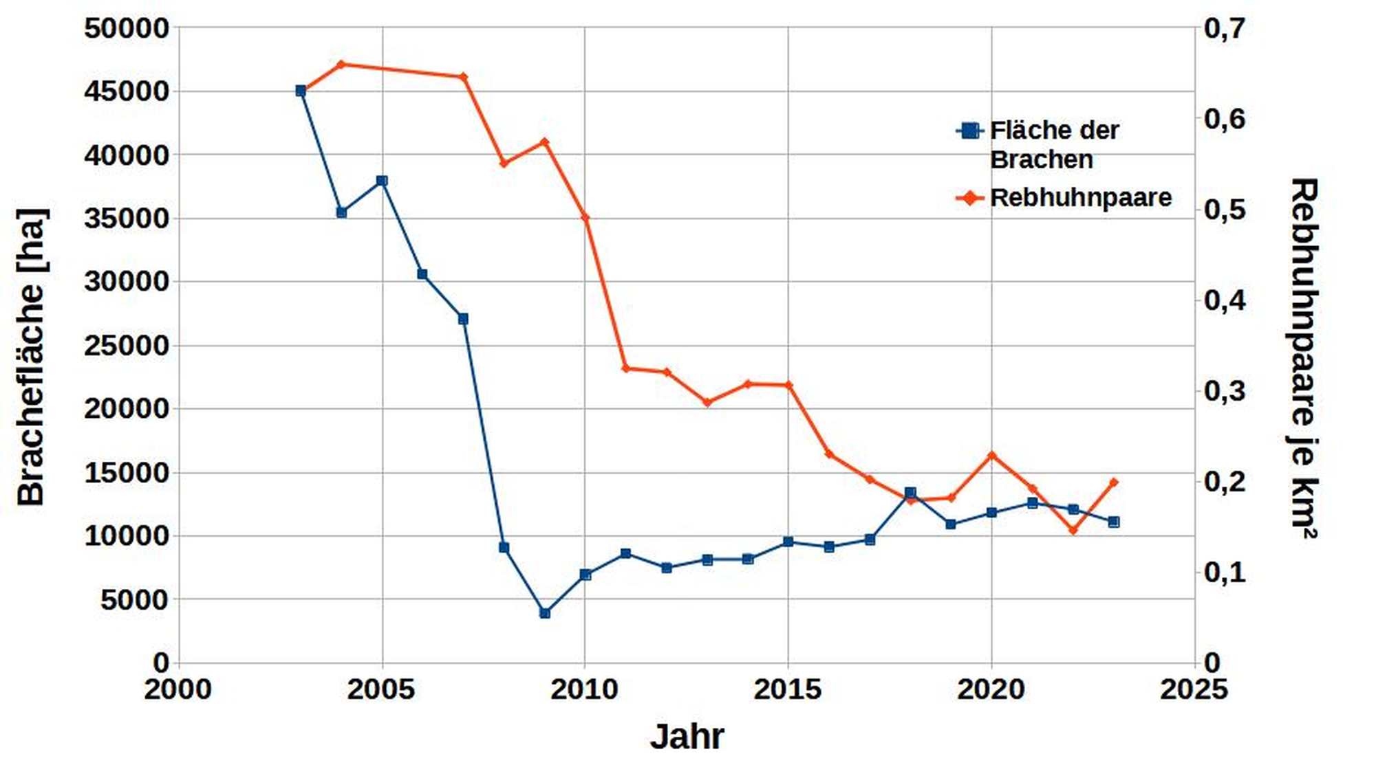 Die langfristige Entwicklung stellt Grund zur Sorge dar: Zwischen 2008 und 2023 gingen in 88 % der erfassten Gebiete die Rebhuhndichten zurück. Nur in 8 % der Flächen wurden Zunahmen beobachtet. Der dramatischste Rückgang fällt in den Zeitraum 2009 bis 2011 und steht im Zusammenhang mit dem Wegfall großflächiger Ackerbrachen infolge geänderter EU-Agrarregeln. Die Fläche solcher Brachareale sank damals von rund 45.000 ha auf unter 10.000 ha – mit verheerenden Folgen für die Art. Inzwischen scheint sich die Population auf sehr niedrigem Niveau leicht zu stabilisieren. Diese Entwicklung könnte mit dem erneuten Anstieg der Brachflächen auf über 10.000 ha zusammenhängen.