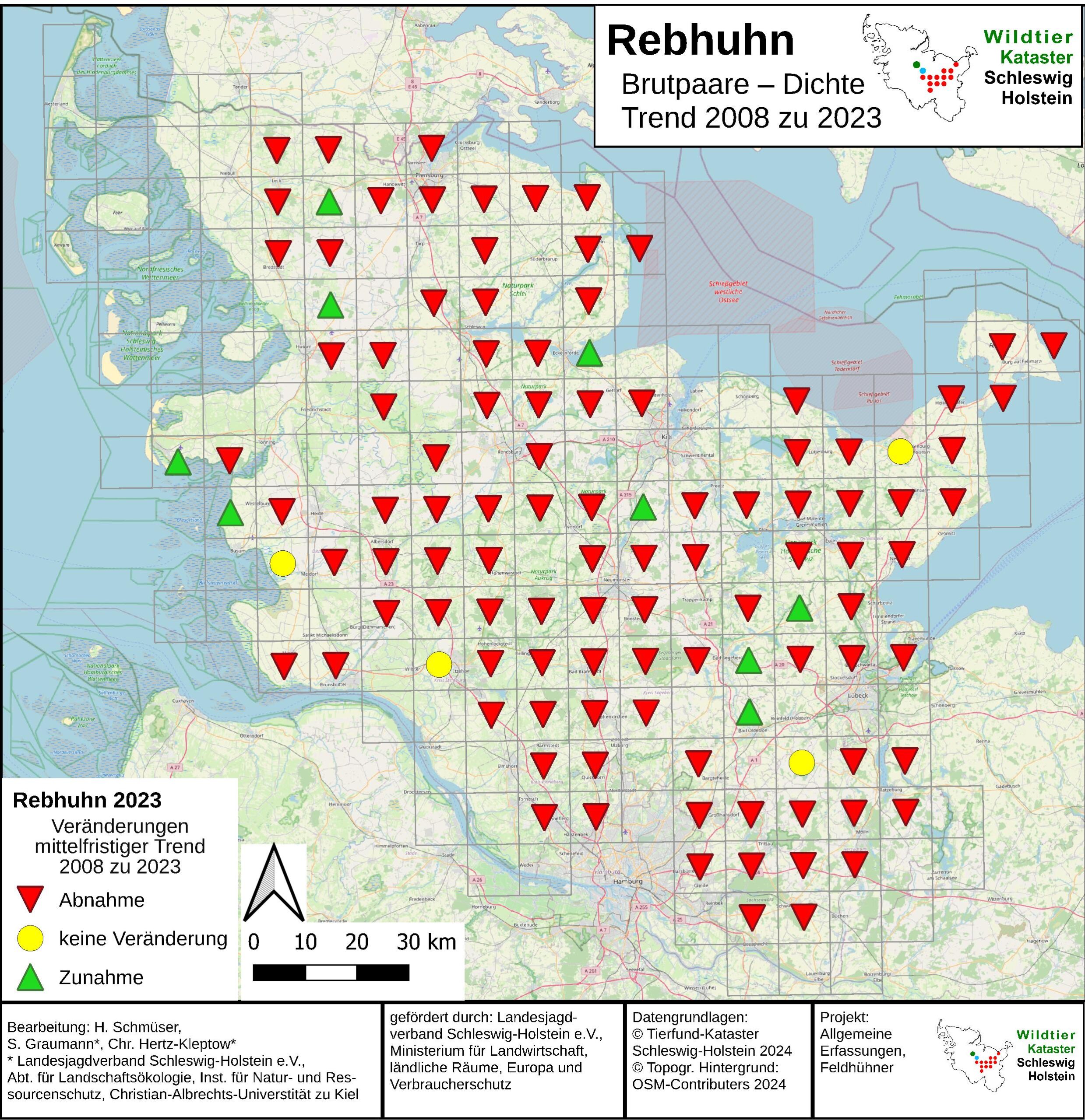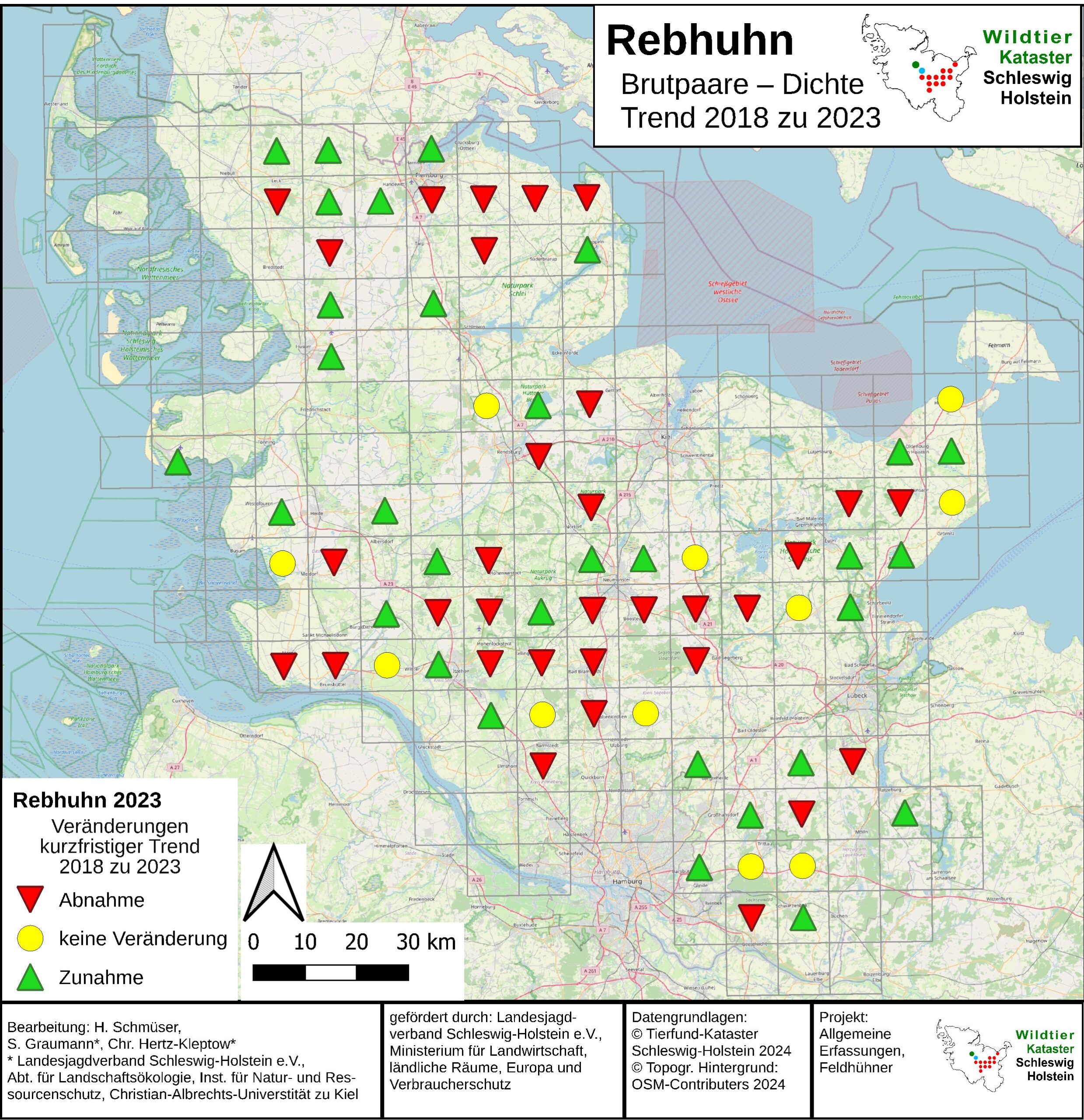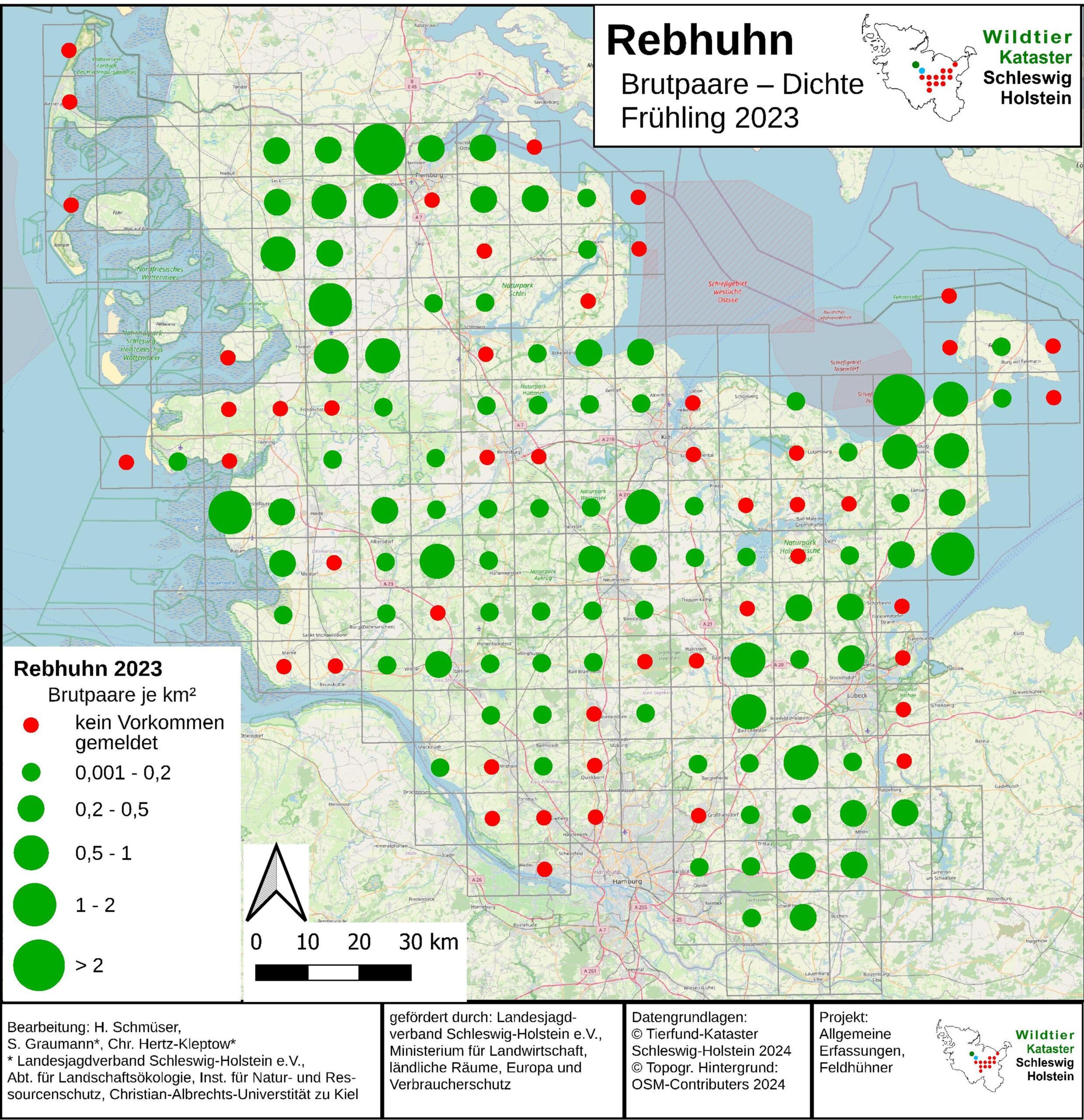 In 903 Jagdbezirken wurden Rebhühner gemeldet, 783 Datensätze konnten zur Berechnung der Brutpaardichte genutzt werden. Auf einer Gesamtfläche von rund 3.950 Quadratkilometern wurden 843 Brutpaare festgestellt – das entspricht einer mittleren Dichte von nur 0,2 Paaren pro km². Der Gesamtbesatz in Schleswig-Holstein wird derzeit auf rund 3.200 Brutpaare geschätzt. Gegenüber 2022 ist damit zwar ein leichter Zuwachs zu verzeichnen, insgesamt bleibt die Art jedoch stark gefährdet.